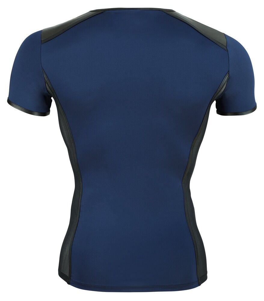 Aufsehenerregendes Shirt in Blau/Schwarz. Raffiniert ist die sehr elastische Materialkombination aus blickdichter, weicher Mikrofaser und transparentem Powernet mit Details im trendigen Mattlook. Vorne mit dekorativer Schnürung. Auf der einen Schulter mit D-Ring. Rücken blickdicht.