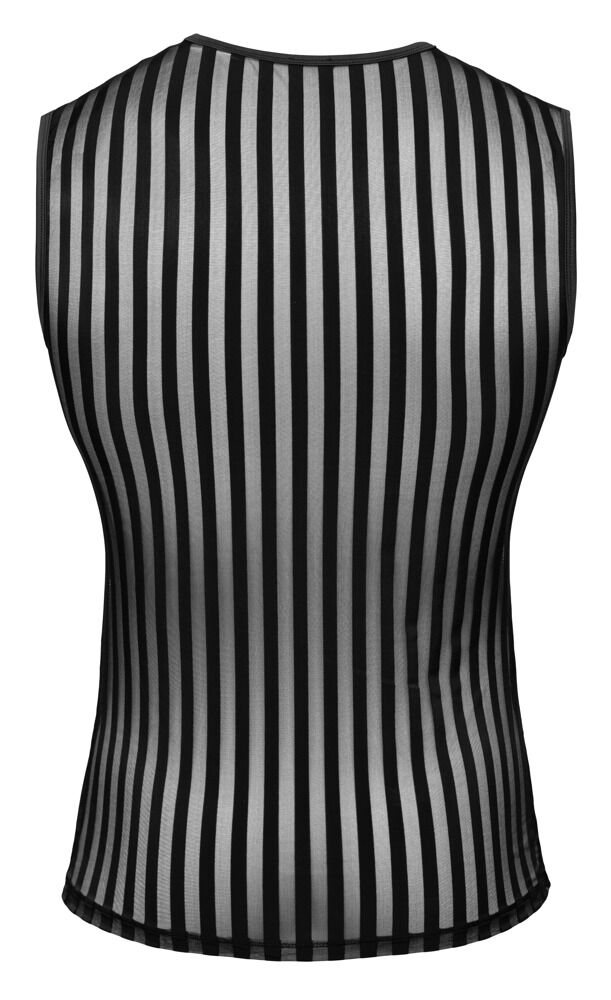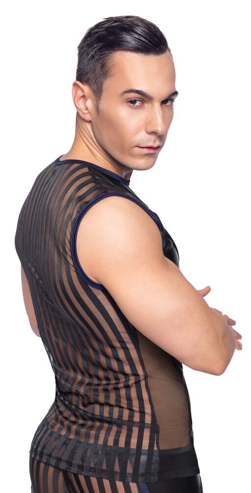 Ärmelloses schwarzes Shirt von finesse HOMME mit effektvollen blauen aufgesteppten Streifen in der Mattlook-Front und eingewebten Längsstreifen im transparenten Powernet-Rücken. Schön elastisch und anschmiegsam für hohen bequemen Tragekomfort.
