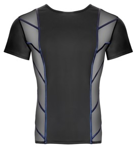 Betonendes Kurzarm-Shirt von NEK im coolen schwarzen Mattlook. Jeweils seitlich schwarz-transparente Netz-Einsätze mit aufgesetzten, rasanten Diagonalstreifen im blauen Metallic-Mattlook. Rundum weich und elastisch für besten Tragekomfort.