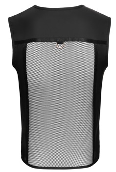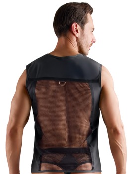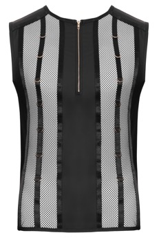 Ärmelloses schwarzes Shirt von Svenjoyment aus zeigefreudigem Netzmaterial im Mix mit angesagtem Wetlook. Rundum elastisch und hautnah weich anschmiegsam für hohen Tragekomfort. Mit goldfarbenem kurzem Front-Reißverschluss vorne. Dazu dekorative goldfarbene Ringe jeweils vorne seitlich und hinten im oberen Rücken.