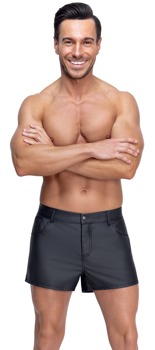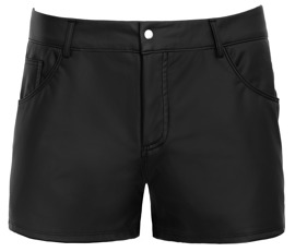 Kurze knappe Shorts von finesse HOMME im schwarzen Mattlook. Im 5-Pocket-Style mit Eingriffstaschen vorne und aufgesetzten Taschen hinten. Vorne mit Druckknopf- und Reißverschluss (unterlegt), Bund mit Gürtelschlaufen. Rundum elastisch und weich für vollen Trage- und Bewegungskomfort.