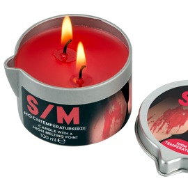 Rot durchgefärbte S/M-Kerze Hot im Tiegel mit 2 Dochten zum Regulieren der Hitze. Schmelzpunkt 54°/56°C. Schmerzt angenehm bei Wachsspielen, sieht aus wie echtes Blut und lässt sich leicht von der Haut abziehen.