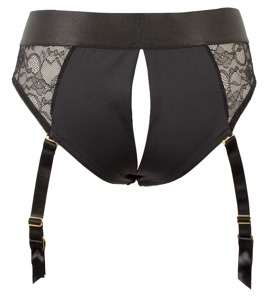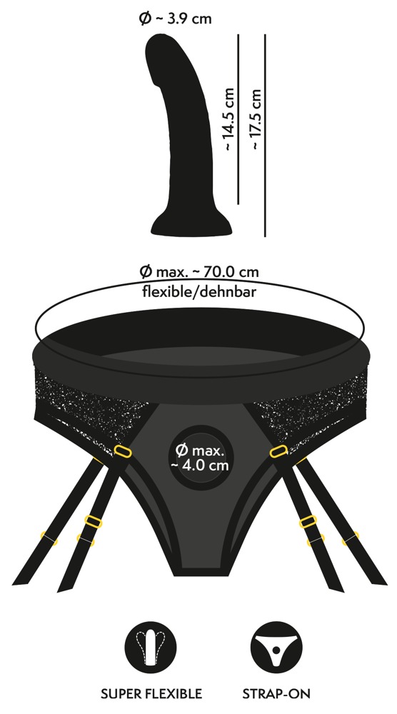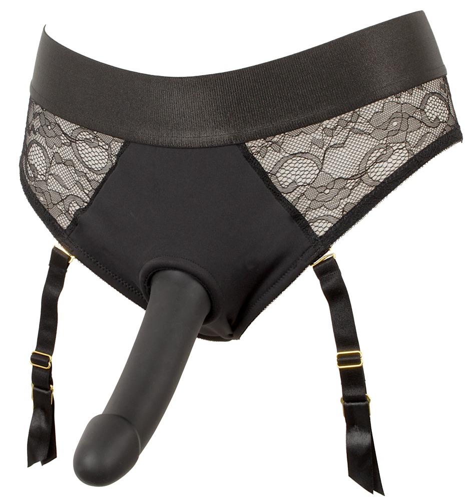 Schwarzer Strap-on-Slip im elastischen Material-Mix aus Mikrofaser und Spitze mit hohem Tragekomfort. Vorne doppellagig mit Einschub gearbeitet und mit diskretem Stretch-Haltering zum einfachen Einsetzen des beiliegenden Saugfuß-Dildos. Auch jeder andere Dildo/Vibrator mit Saugfuß (Ø max. 4 cm) kann eingesetzt werden. Über dem Po mit einladendem Cut-out. Die Strumpfhalter sind verstell- und auch komplett abnehmbar.