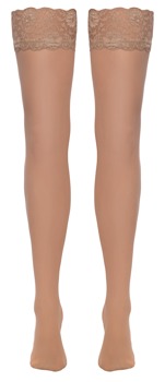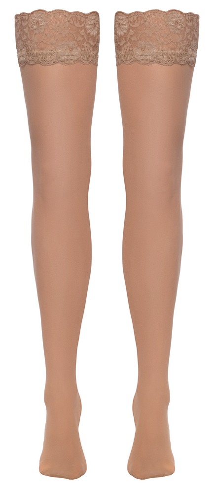 Nudefarbene, seidige Strümpfe von Cottelli LEGWARE mit elastischem, 9 cm breitem Spitzen-Abschluss. Garnstärke 20 den. Oeko-Tex zertifiziert.