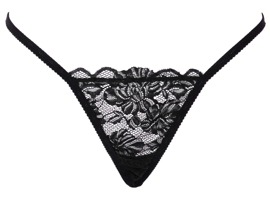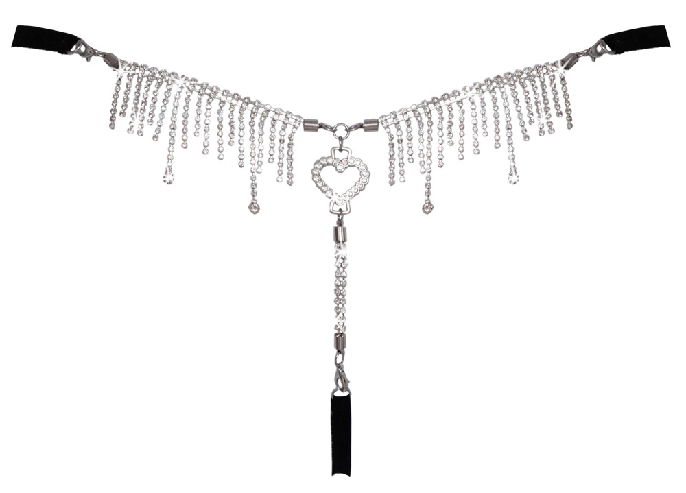 Luxuriöser, schwarzer String von Cottelli LINGERIE mit einer Front aus zarter weicher Spitze. Der hintere String-Teil ist aufwendig mit Strasssteinchen und -kettchen gearbeitet. Der opulente Schmuck mit dem großem Strassherz in der Mitte ist (für die Handwäsche) komplett abnehmbar. Die seitlichen Stretchbänder am Bund sind passend verstellbar.