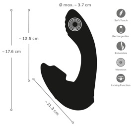 7 prickelnde Vibrationsmodi auf der einen und 7 züngelnde Leckmodi auf der anderen Seite sorgen für vielseitiges Vergnügen und sind direkt am Toy bequem per Knopfdruck getrennt oder kombiniert steuerbar. Rundum mit Soft Touch Textur überzogen, gleitet der Vibrator wie von selbst über die Haut und lässt sich besonders leicht einführen.