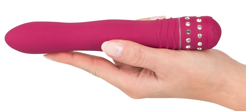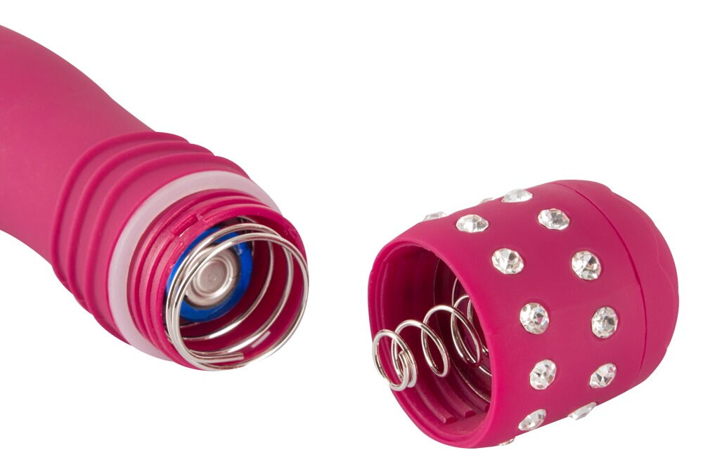 Schlanker Vibrator mit funkelnden Strasssteinchen am Schaftende. Die stufenlos einstellbare Vibration von zart bis heftig lässt keine Stimulationswünsche offen.