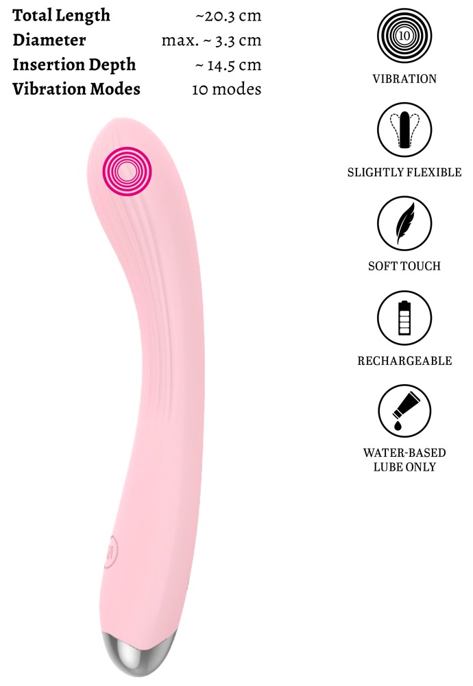 Stilvolles klares Design und starke Technik vereinen sich in diesem perfekt gebogenen Curved Vibrator KIREYA von beau cœur. Mit seiner sanften Kurve verführt der seidige Silikonvibrator zu kreativen Intimspielen allein und zu zweit. Dabei verwöhnen 10 vielseitige Vibrationsmodi von sinnlich bis intensiv – ganz nach Wunsch und einfach per Knopfdruck. Raffinierte Rillenstrukturen verstärken die Empfindungen zusätzlich für ein intensives Erlebnis.