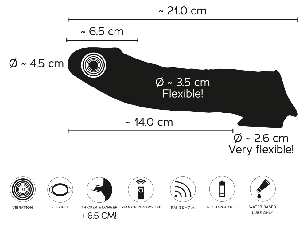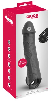 Geschlossene Vibro-Penishülle von ORION mit praktischer Fernbedienung. Bringt den Penis schnell und einfach in Bestform: 6,5 cm länger, spürbar dicker und bereit für ausfüllende und tiefgehende Lustmomente! Und vibrieren kann er dann auch noch – gleich in 10 verschiedenen Modi. Bequem mit der kleinen Fernbedienung (Reichweite 7 m) steuerbar von beiden!