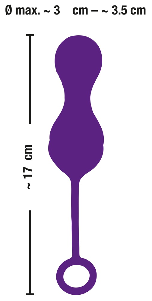 Gesamtlänge 17 cm. Vibrokugeln 9 cm lang, Ø 3 cm bis 3,5 cm. Gewicht 73 g. Silikon, PU, ABS.